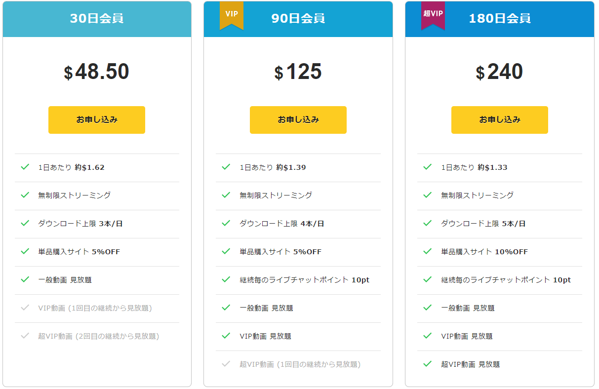 最初から90日会員や180日会員になるとVIP作品や超VIP作品が視聴可能です。